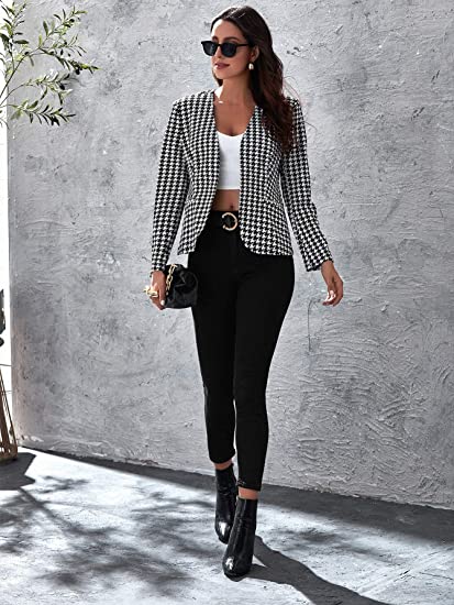 Women Elegant Open Front Houndstooth Blazer Work Office Jacket Outwear